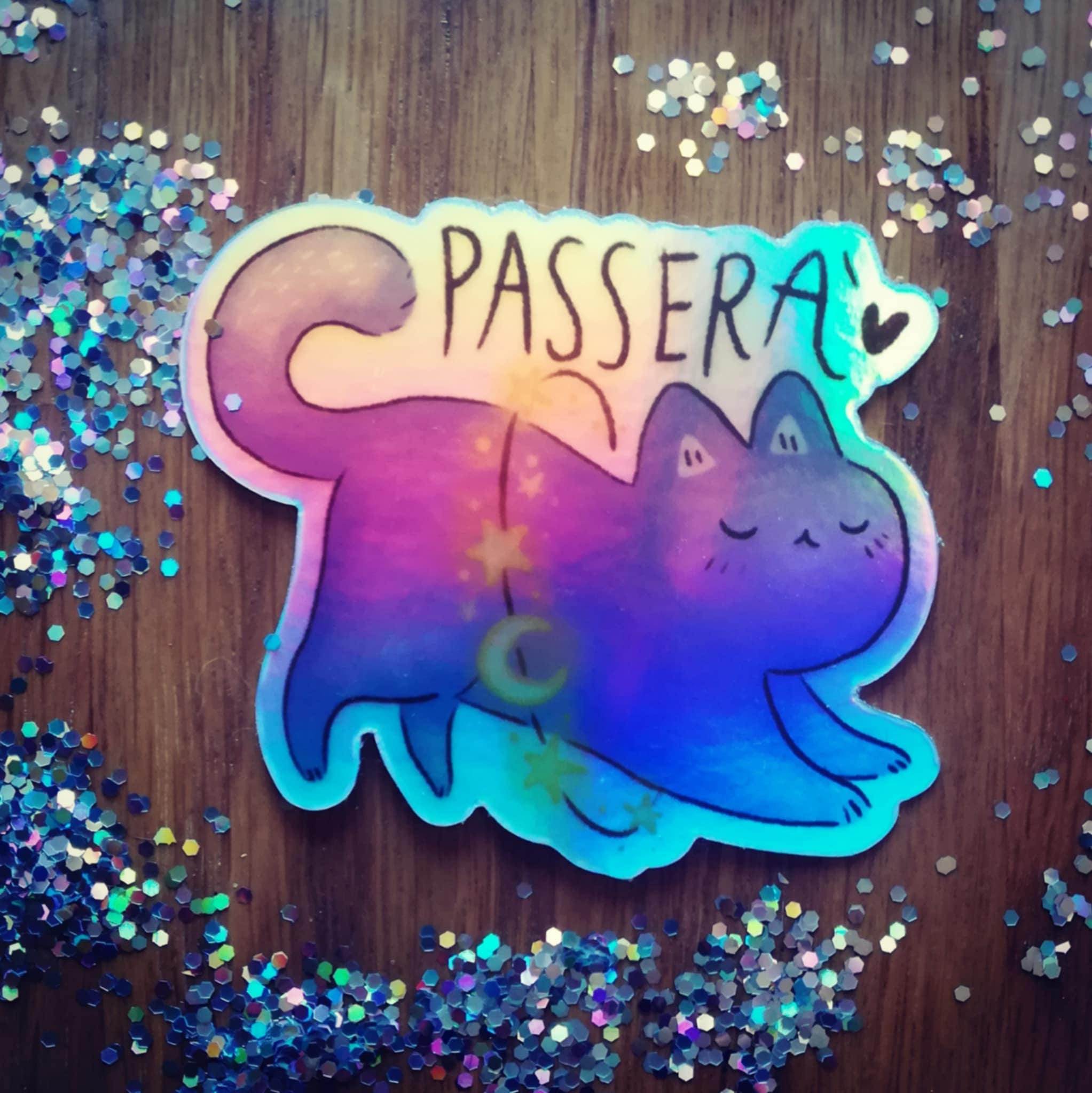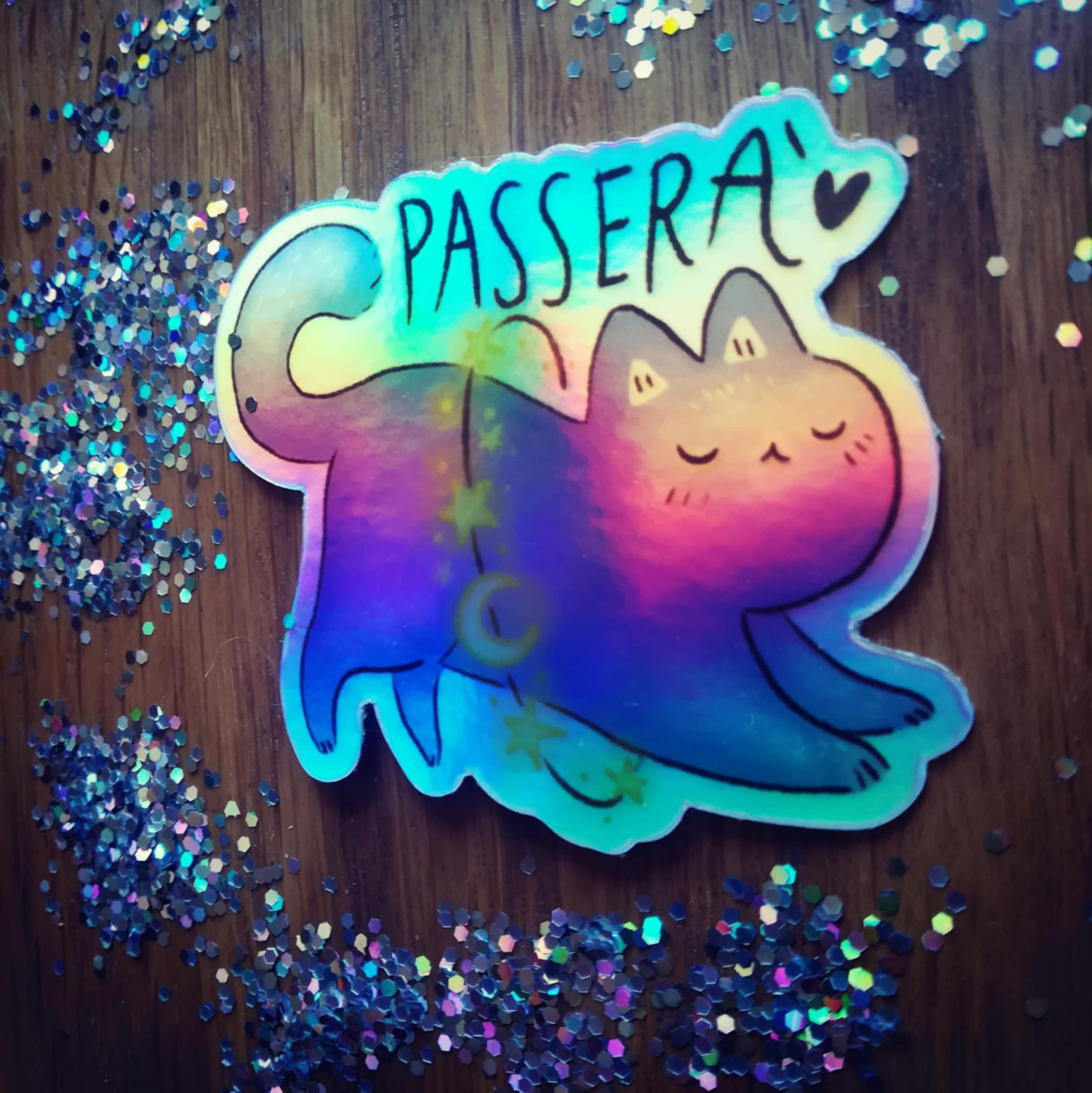 Adesivo olografico illustrato glitter con gatto tra le stelle e scritta “Passerà”