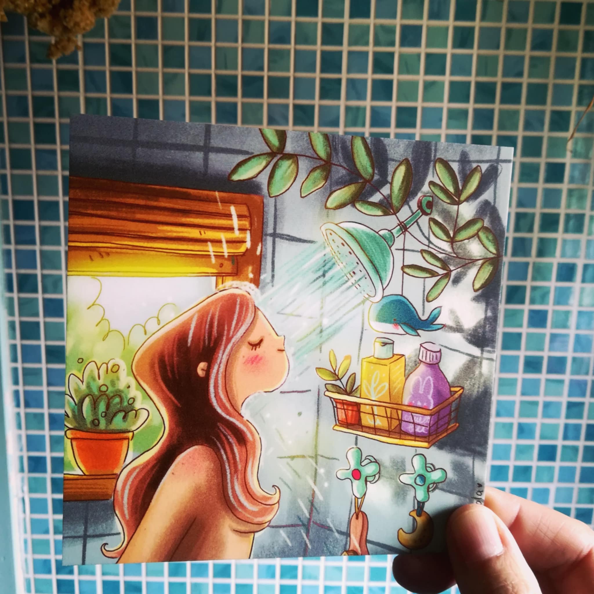 Cartolina illustrata con illustrazione di una doccia rilassante
